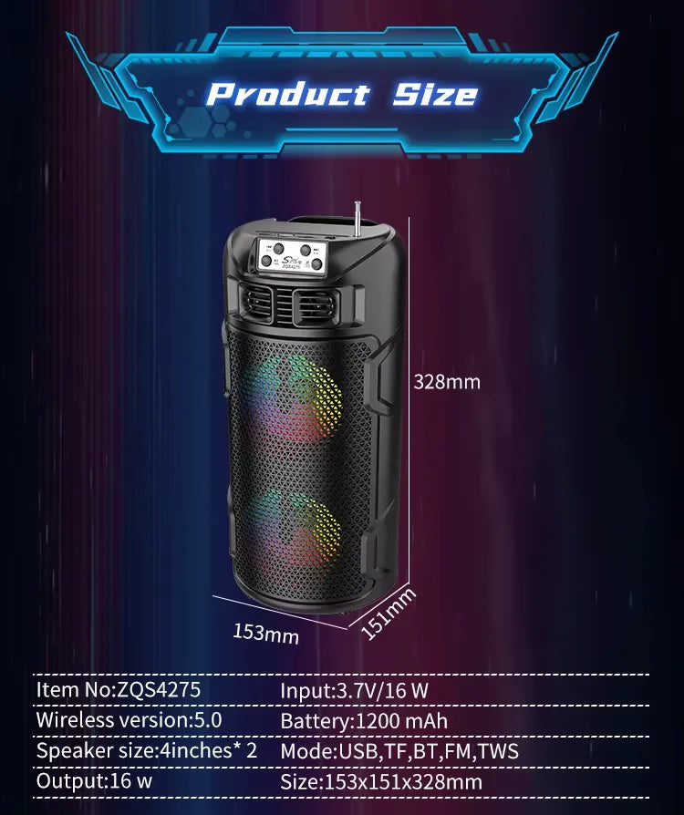Boxă Wireless ZQS4275 – Bluetooth, Radio FM, USB/TF, TWS, Iluminare LED, Încărcare Solară, Antenă Externă, Fără Telecomandă