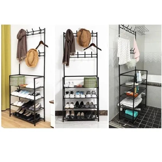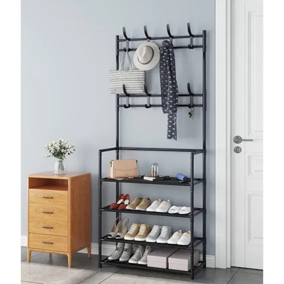 Cu 4 rafturi și 8 cârlige integrate, suportul oferă un mod inteligent de a organiza pantofii, hainele și accesoriile. Perfect pentru holuri, dormitoare sau dressinguri, economisește spațiu și menține ordinea zilnică.
